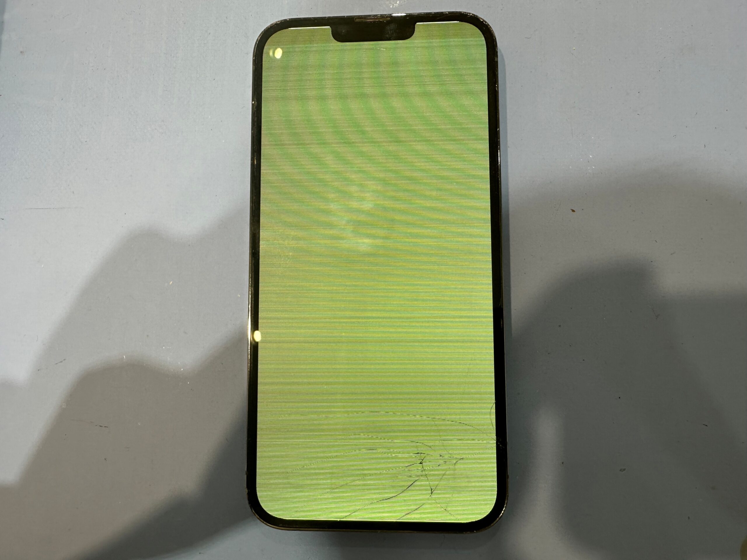 iPhone修理のスマップル香川高松店です。 本日はiPhone13Promaxの画面修理をご紹介いたします。 まずは本体の状態を確認していきます。 ~交換前~ ご覧の通り、画面の右下に割れています、更に全面緑色になり、 …投稿日:2025-11-19