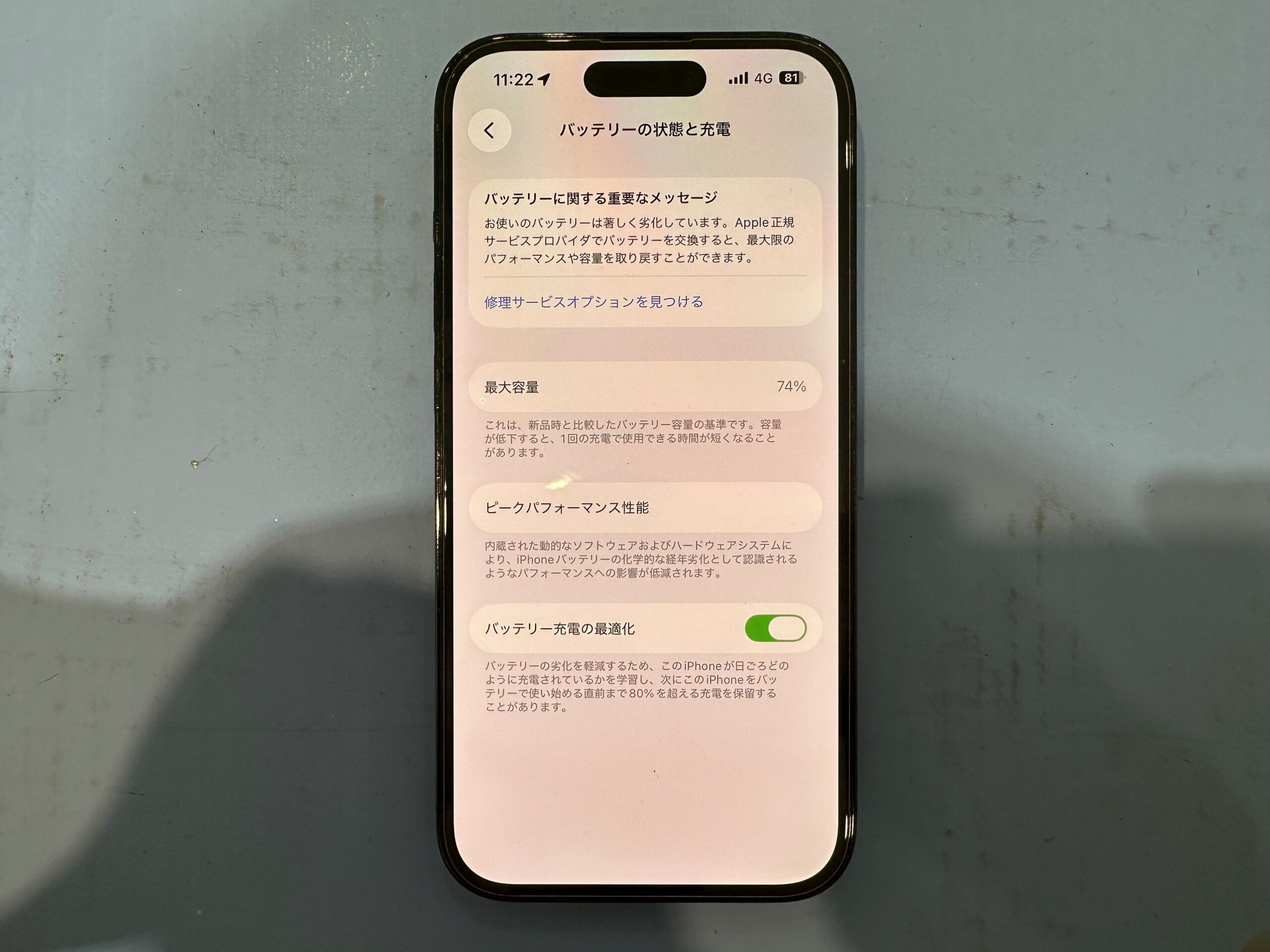 するとバッテリーの最大容量が 74% に落ちていることがわかります。