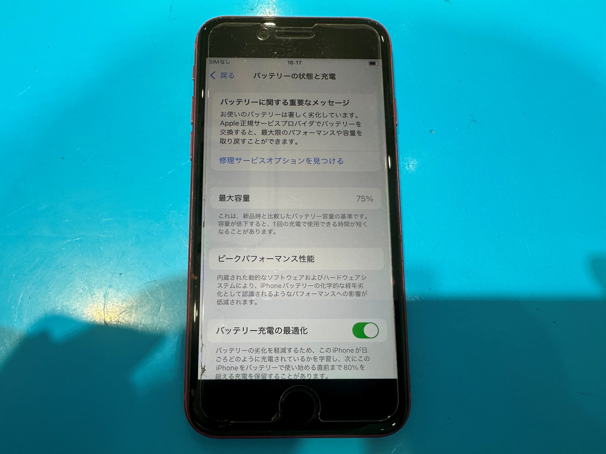 iPhone修理のスマップル香川高松店です。 本日はiPhoneSE2のバッテリー交換をご紹介いたします。 まずはバッテリーの状態を確認していきます。 ~交換前~ バッテリーの状態を確認する方法↓ 【設定】→【バッテリー …投稿日:2025-12-18