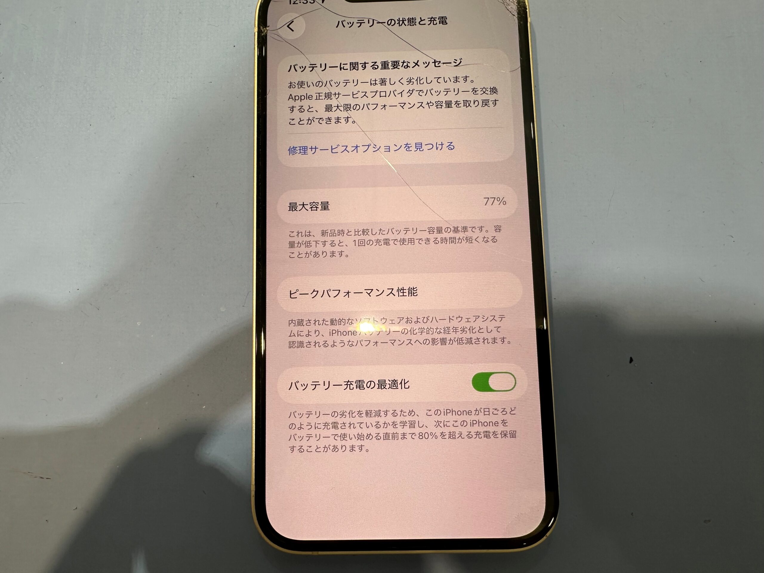 するとバッテリーの最大容量が 77% に落ちていることがわかります。