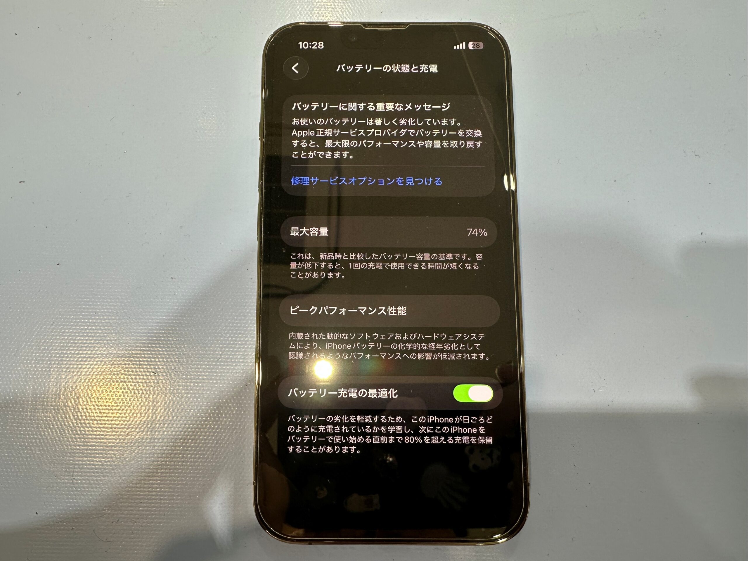 こちらのiPhone13Proはバッテリーの最大容量が 74% に落ちていました。
