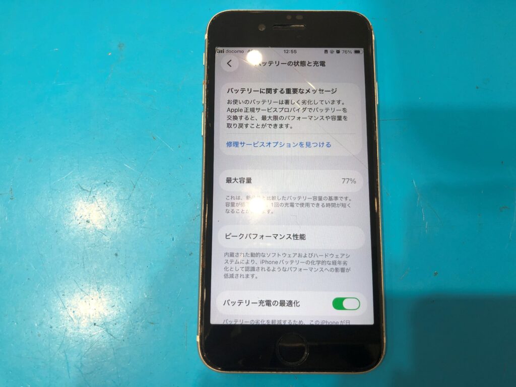 今回、ご来店されたお客様のiPhoneのバッテリー最大容量は77%でした。
